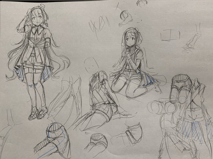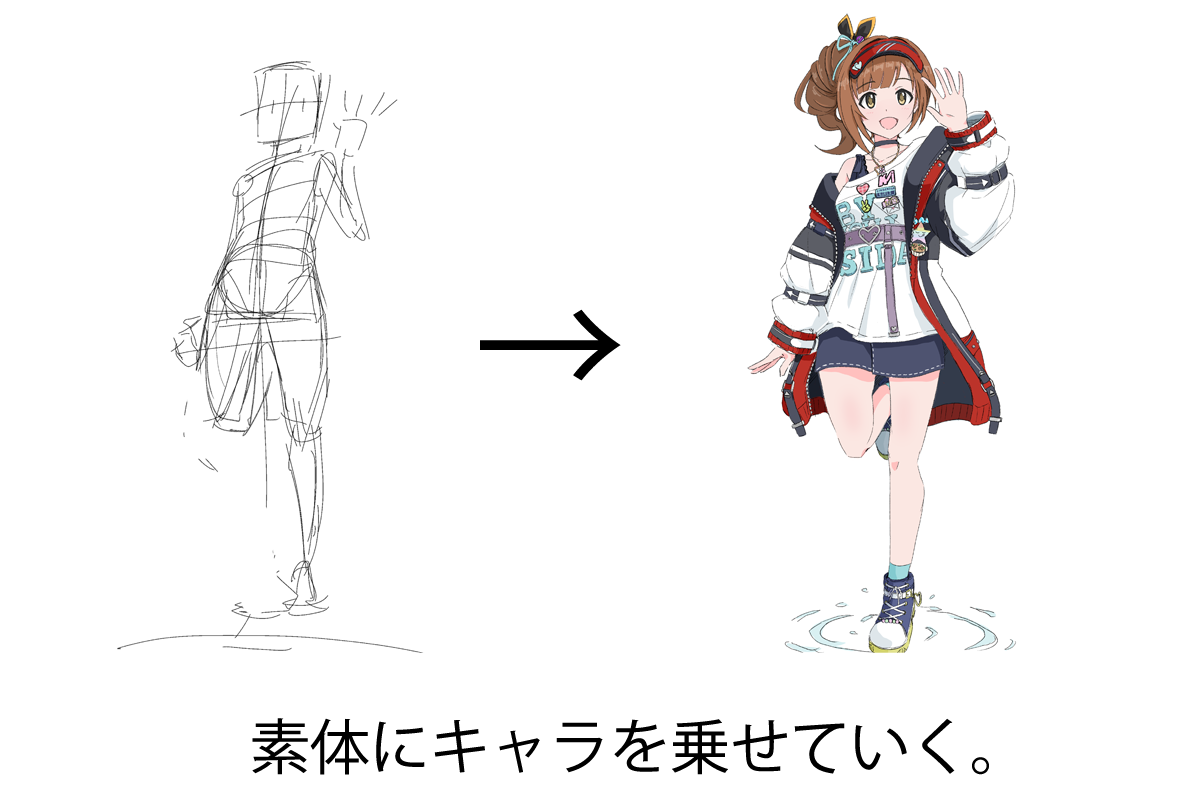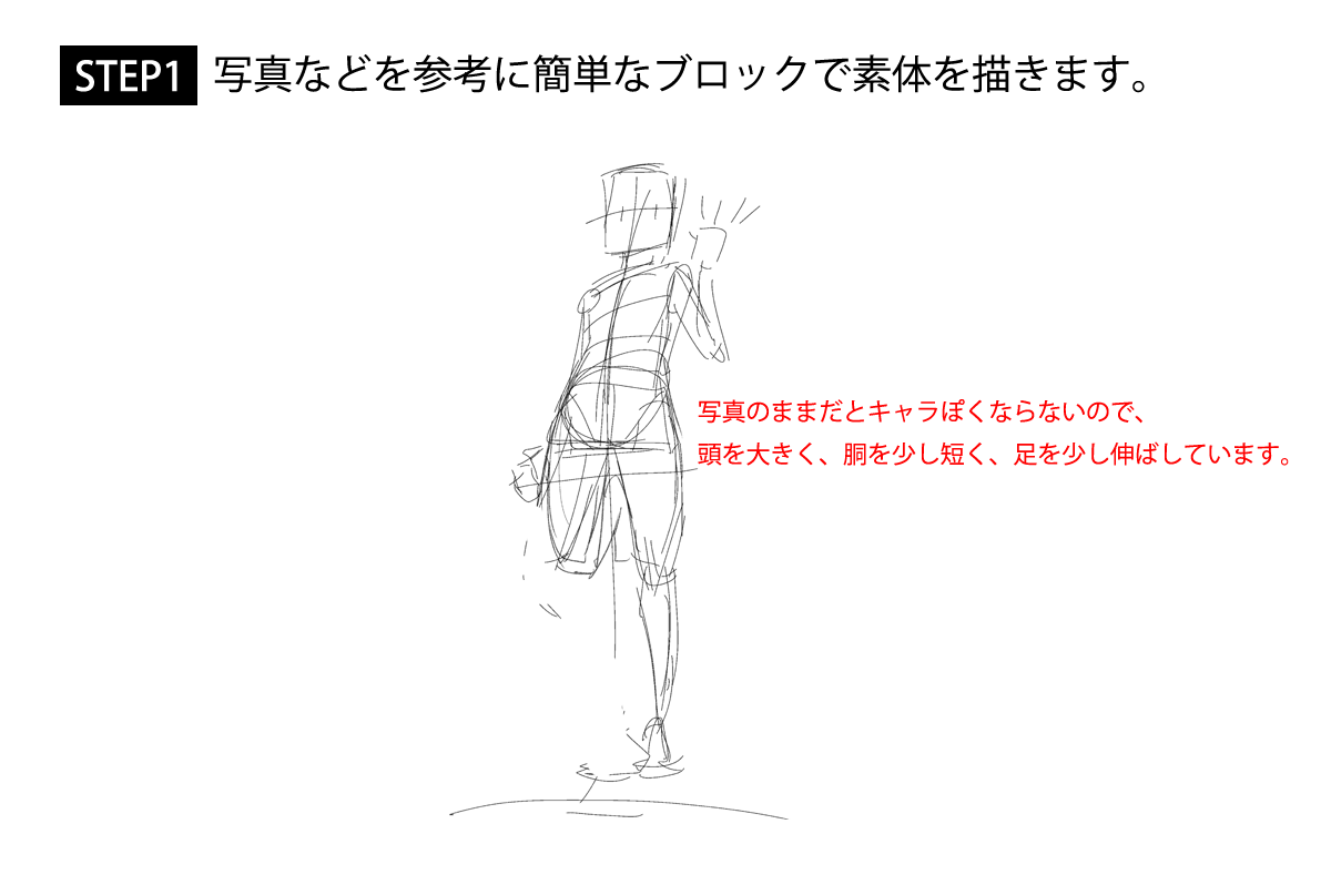いつものクロッキーの素体にキャラをのせていくのはどうだろうか。