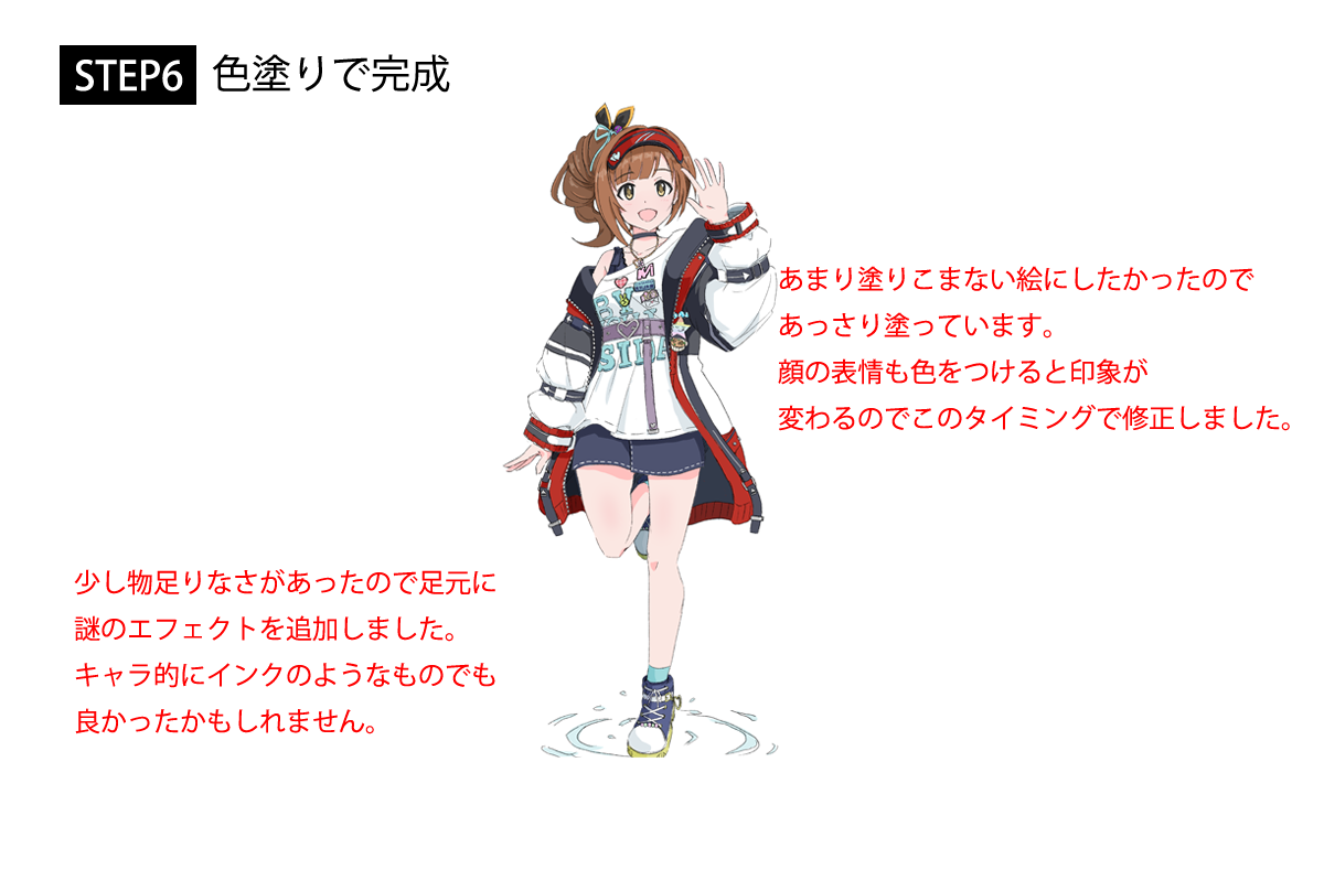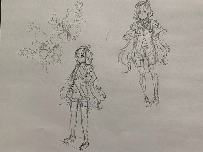 服のデザインもこないだまで「配信動画」を見ながら描いていたので、どうなってるのかわかりづらい箇所もあったけど、今回はキャラクターの3面図をもとに描いたので服装に関する理解がかなり楽になった。