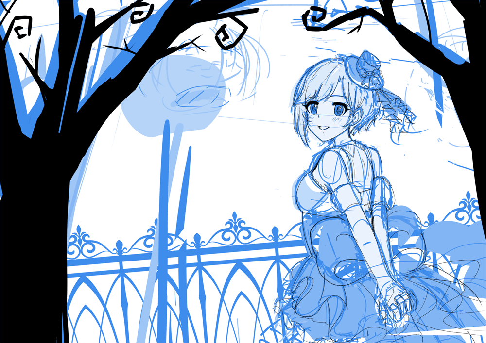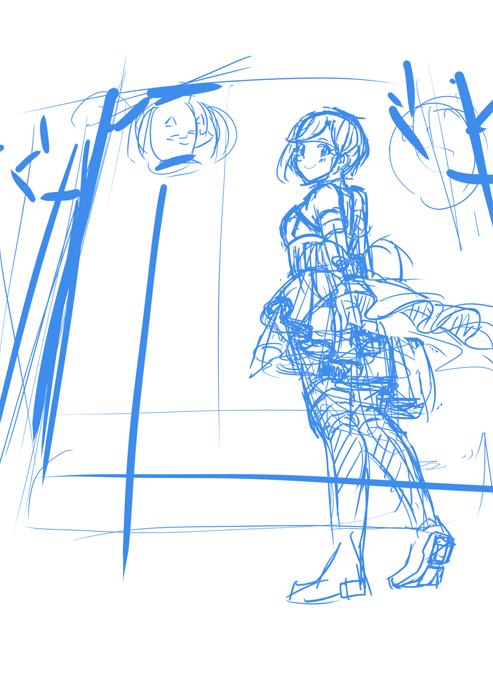 テーマでもあげたように「あおり構図」を描くと決めて構図を考えています。