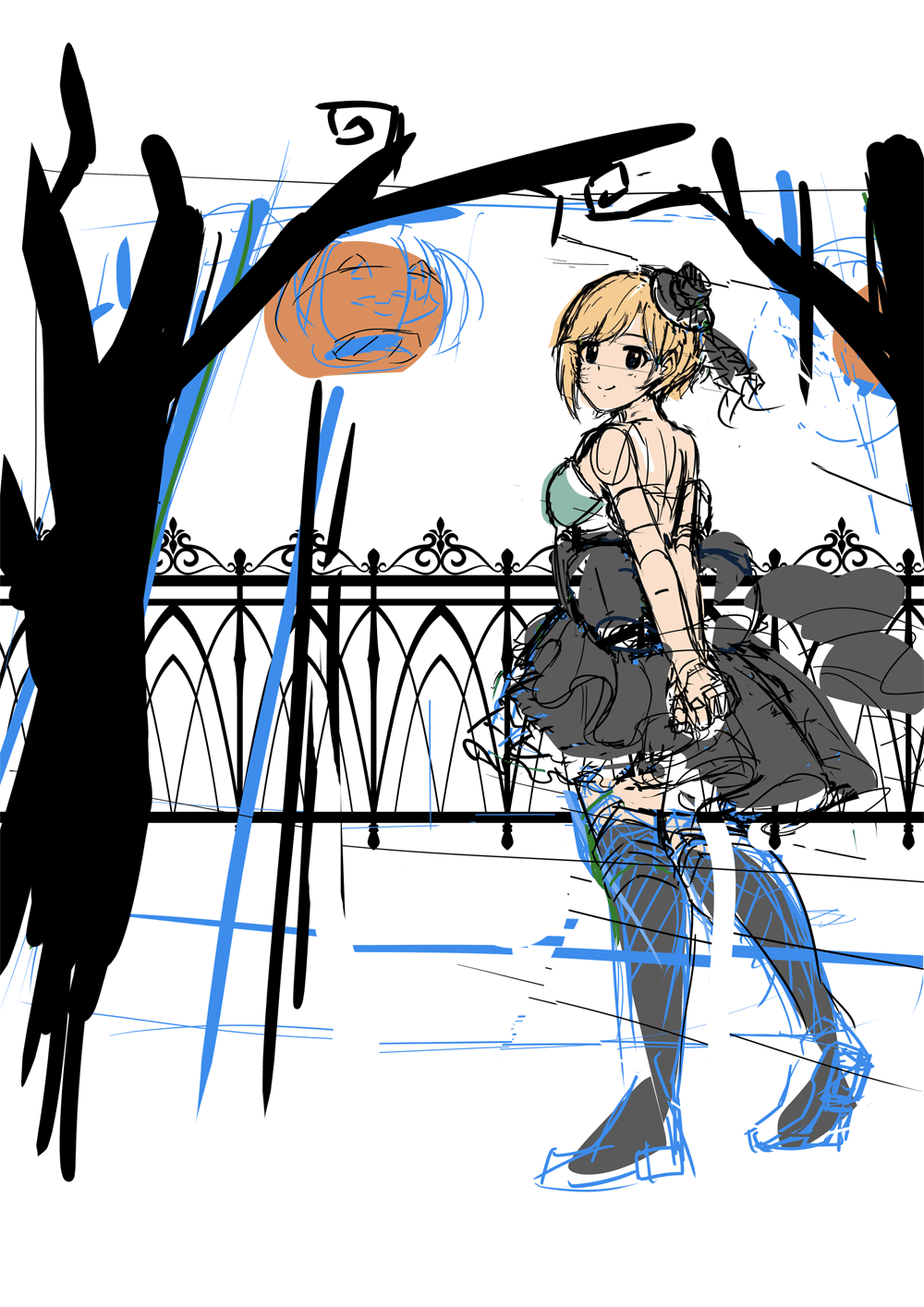 ざっくりと色を乗せてバランスを修正しながら描き足りなかった箇所を追加していきます。。さきほどのスカートのひらひらもここで付けています。