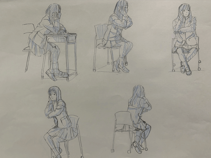 机・椅子を描くのが大変だった。座ってる感は出せるようになってきたけど、机・椅子とのサイズ感があってない気がする。