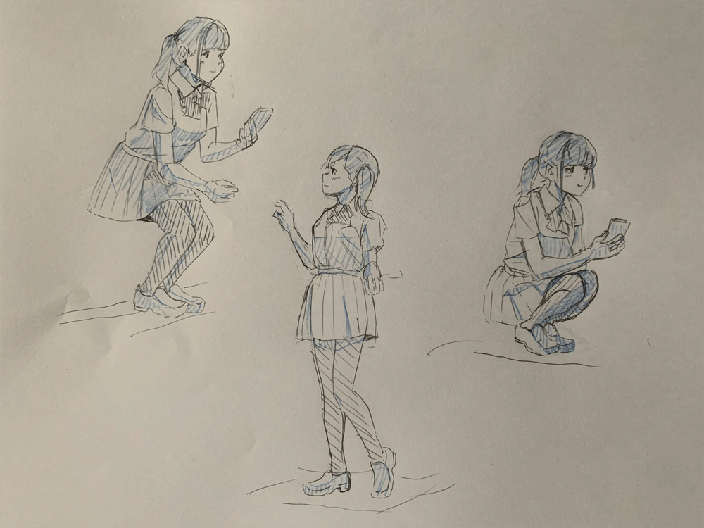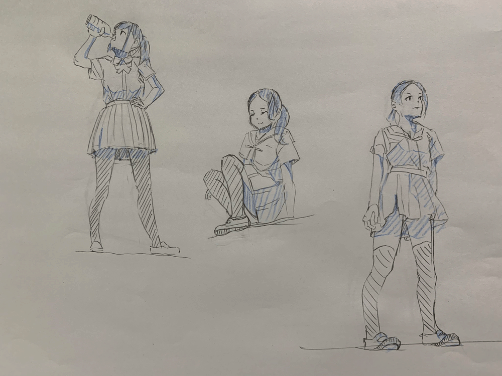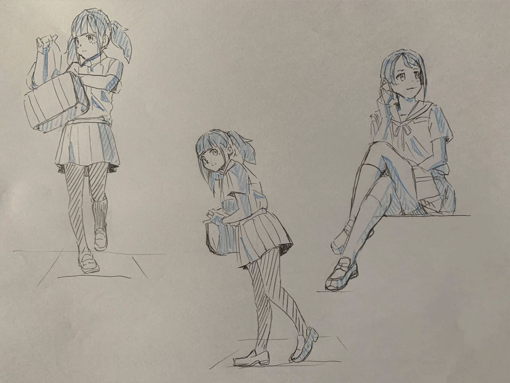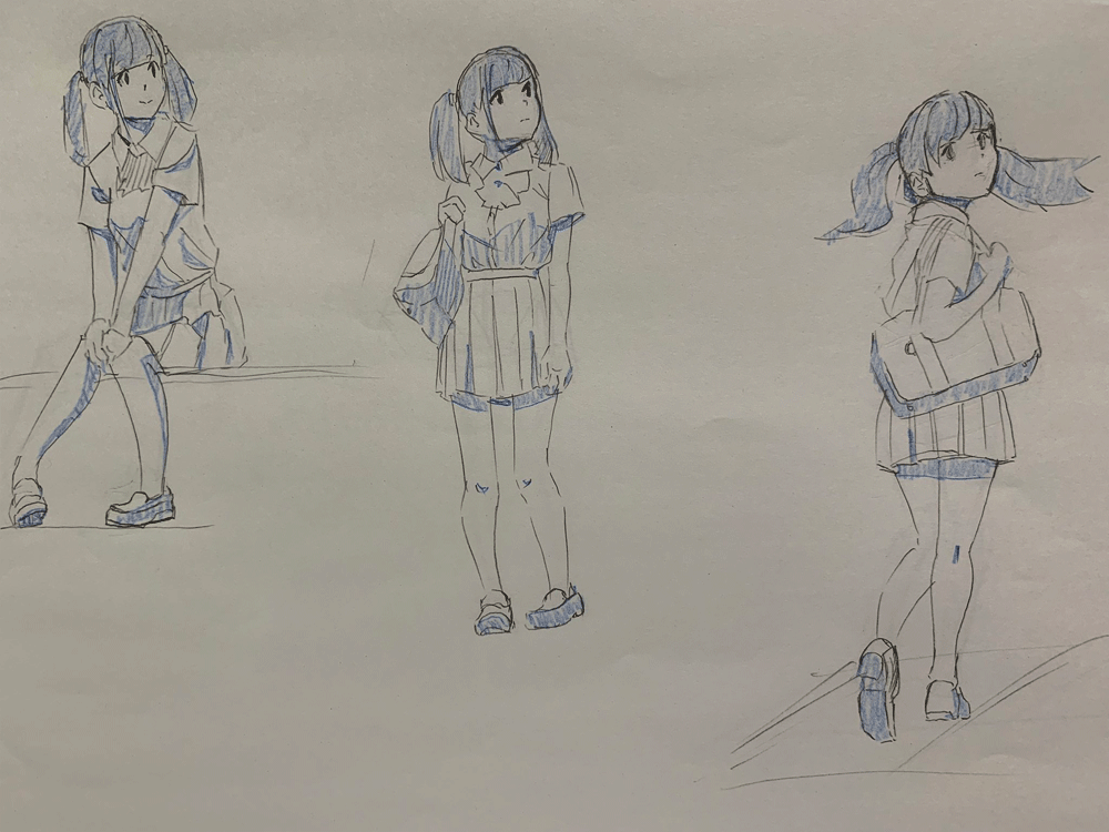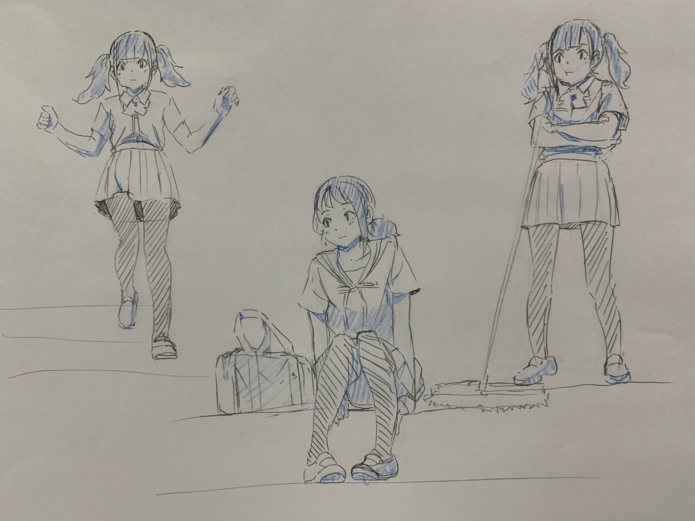 キャラクターをのせるのを忘れてしまったかと思うくらいこれまでのクロッキー練習と同じくらいの頭身になってしまった。色々参考にしながら研究しなおしてみる。