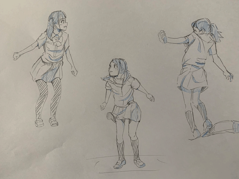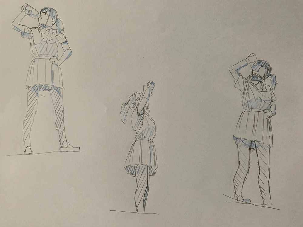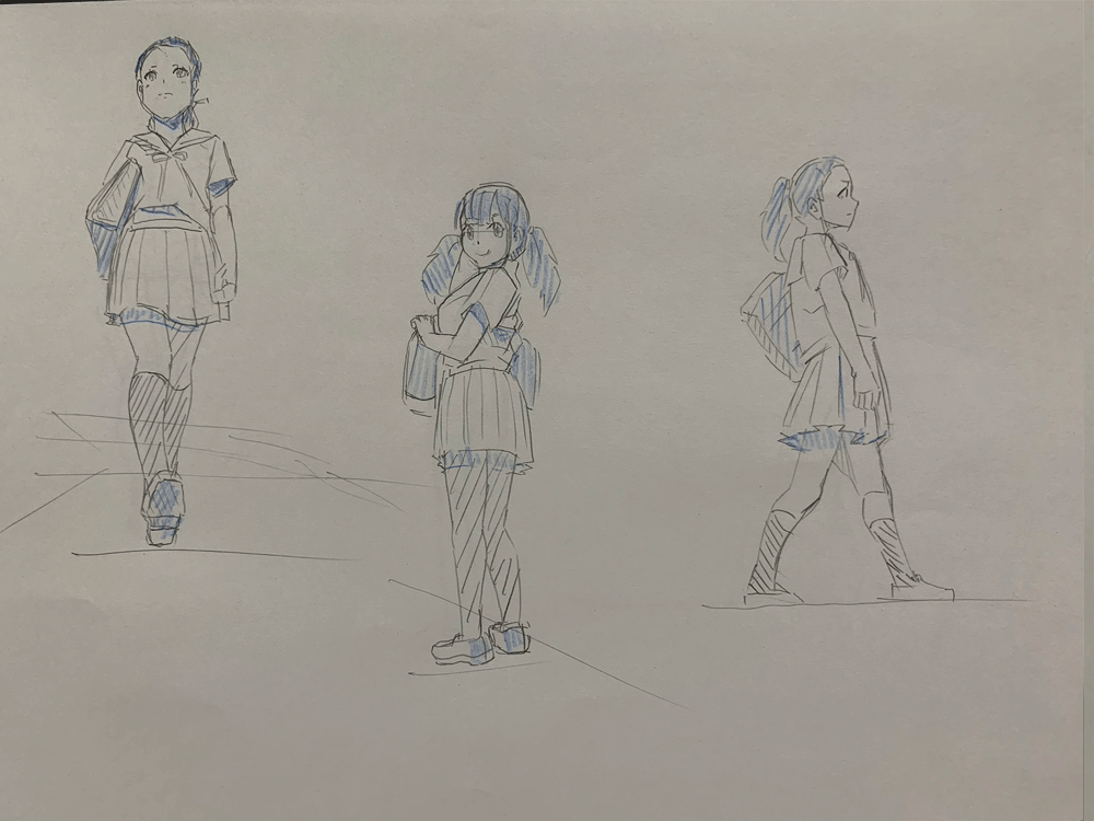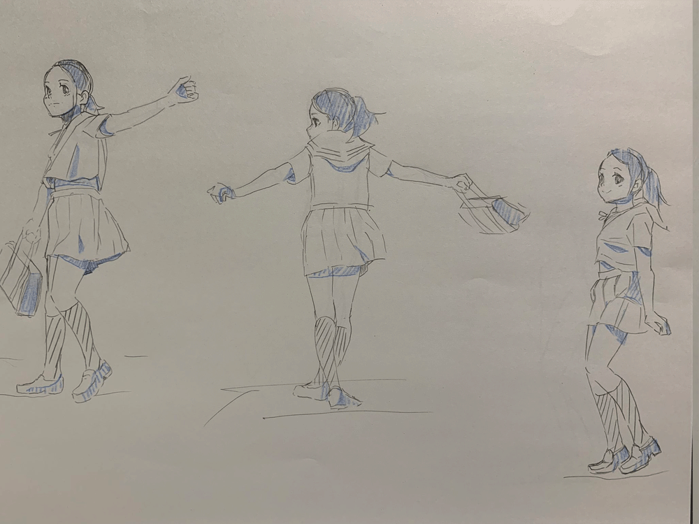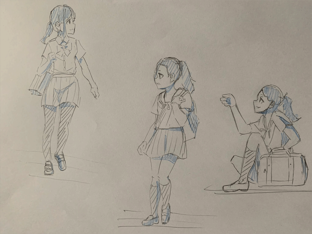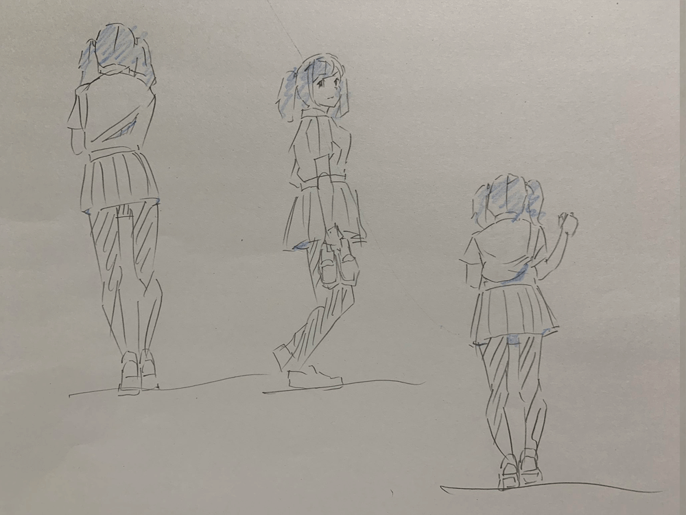 キャラクターをのせるのを忘れてしまったかと思うくらいこれまでのクロッキー練習と同じくらいの頭身になってしまった。色々参考にしながら研究しなおしてみる。