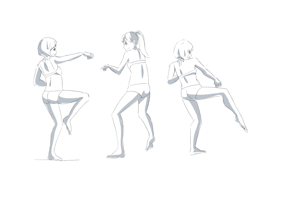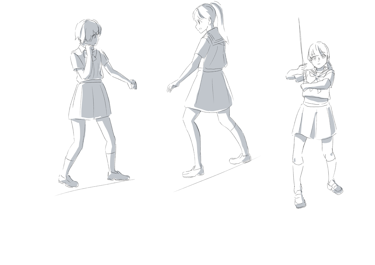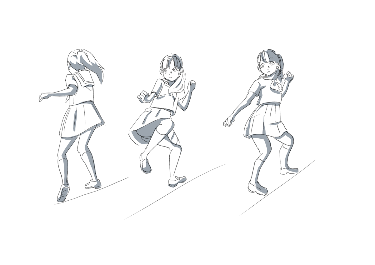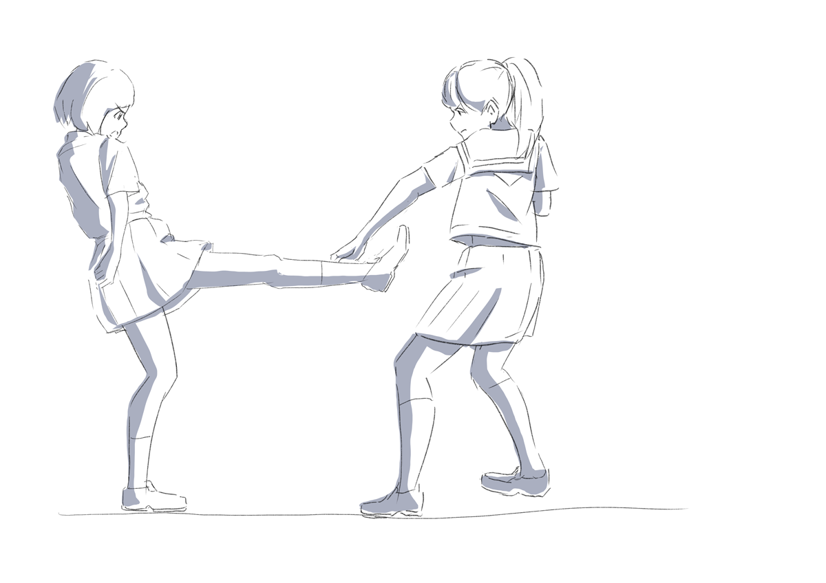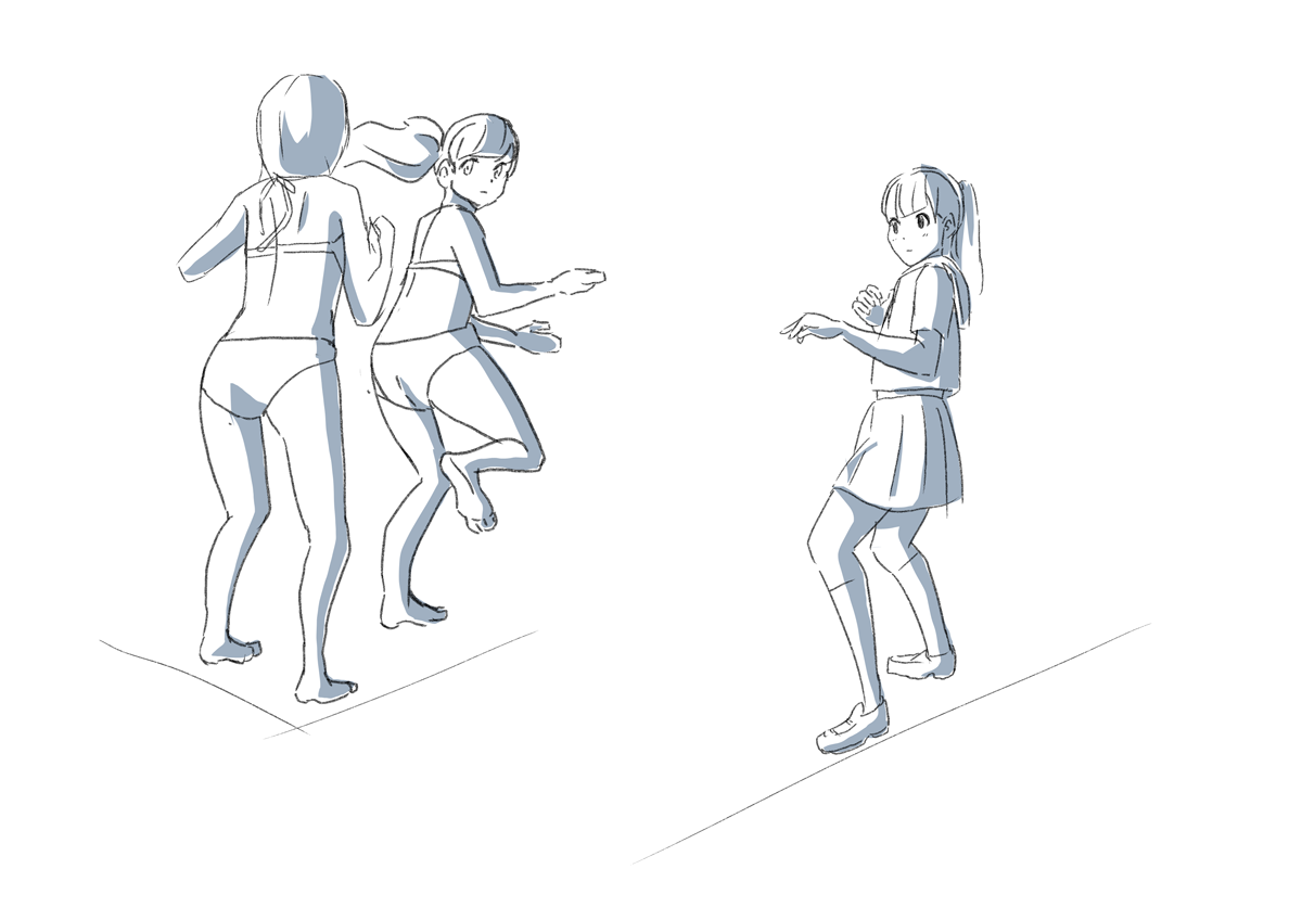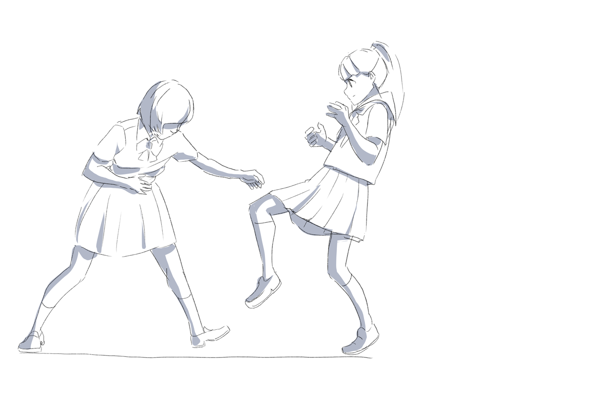 左の人の軸足(左足)と右の人の右足のパースを合わせたほうがよかったのかもしれない。パースまだ理解しきってないからこういったところで悩む。