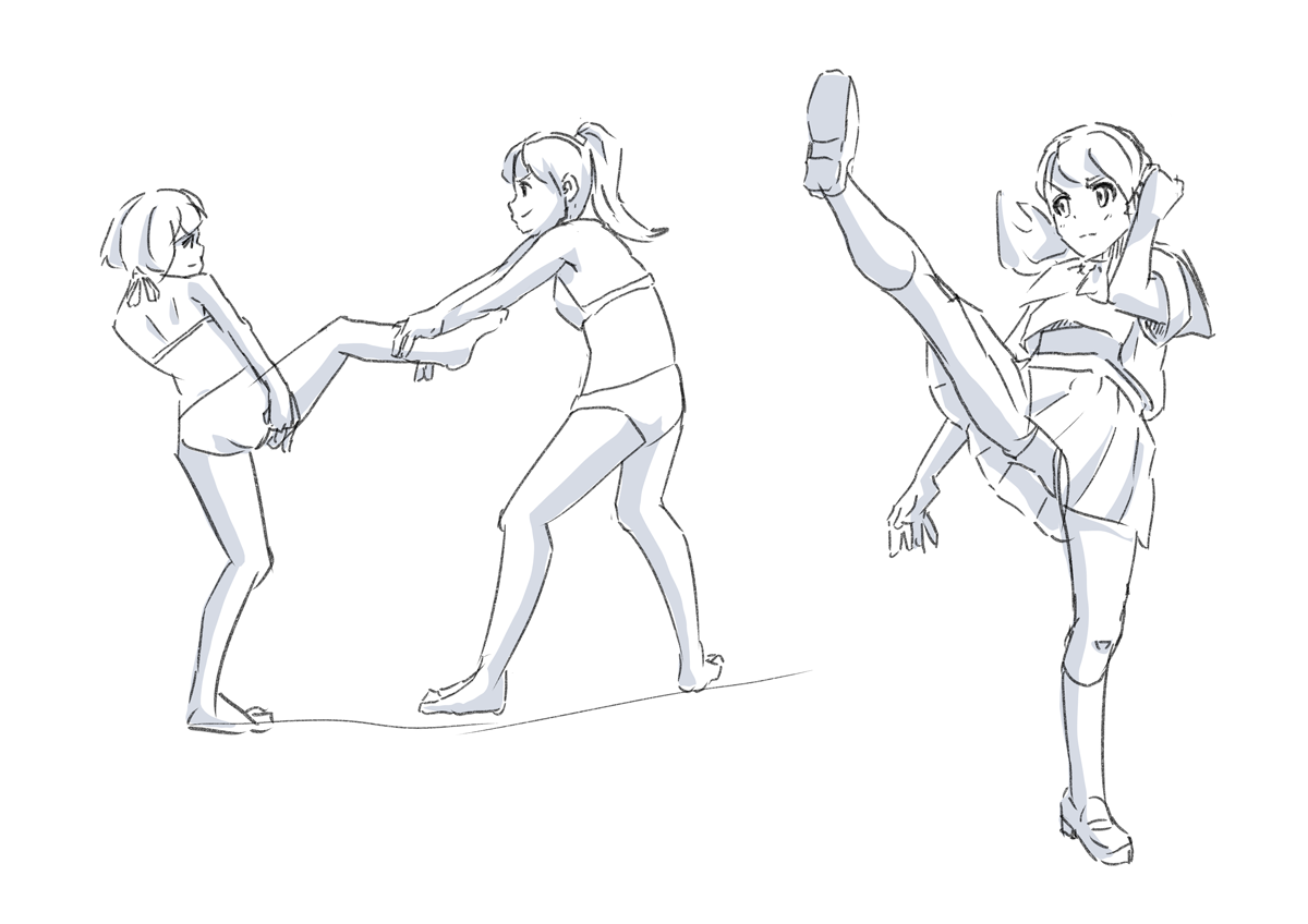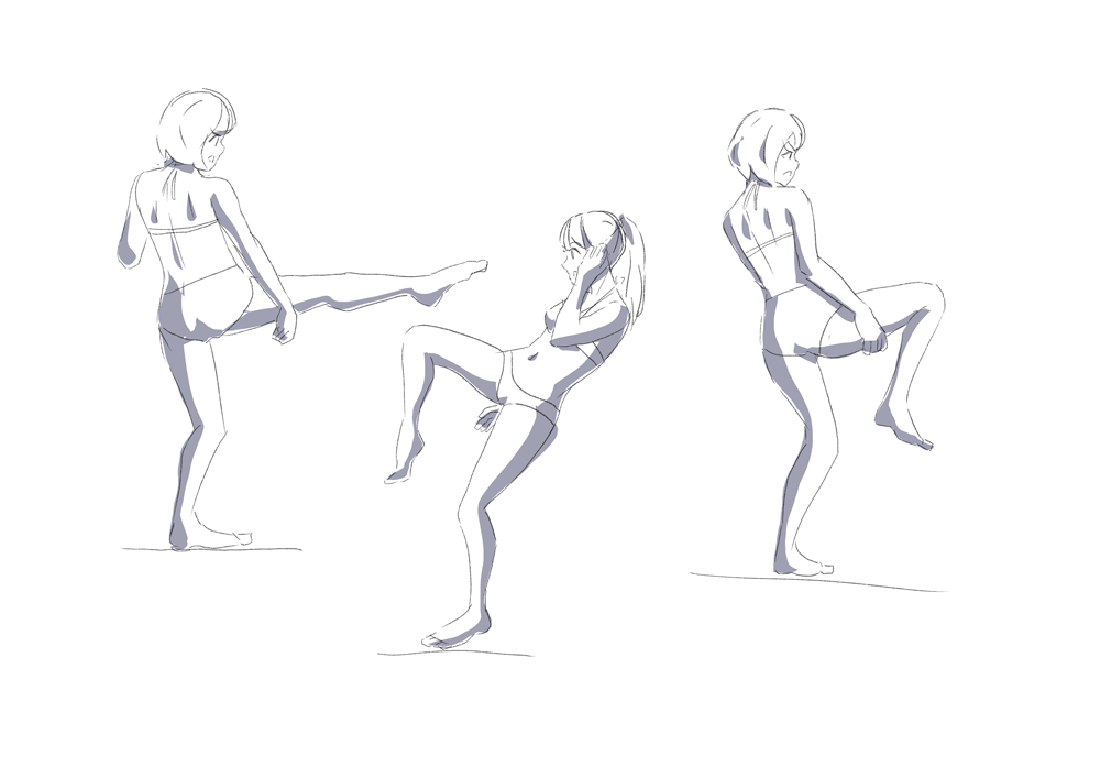 左の人がぐらついてる様子から蹴り終わったあとのように見える。行動の前後を描くと動きがわかるようになるとなんかの本に書いてあったのを思い出した。