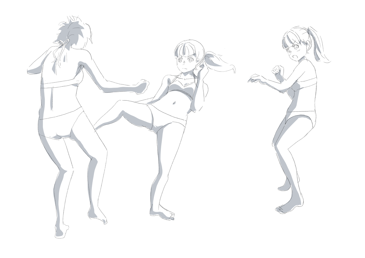 左の2人はパース線を描いていないけど同じパースに乗ってる絵。前後感は描けた気はする。