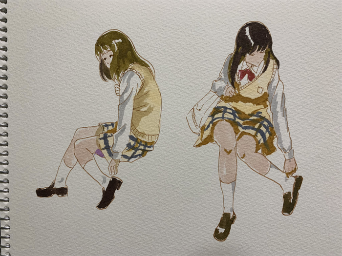 練習毎日クロッキーの中から上手く描けたものをピックアップして、水彩紙に写しその後水彩ペンを使用して色を塗っています。