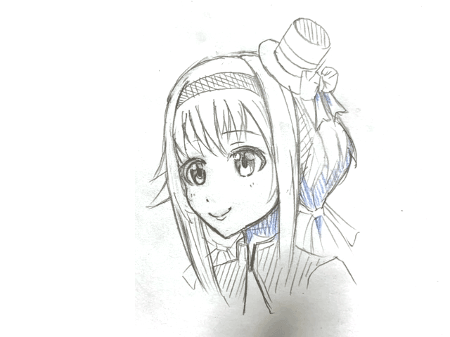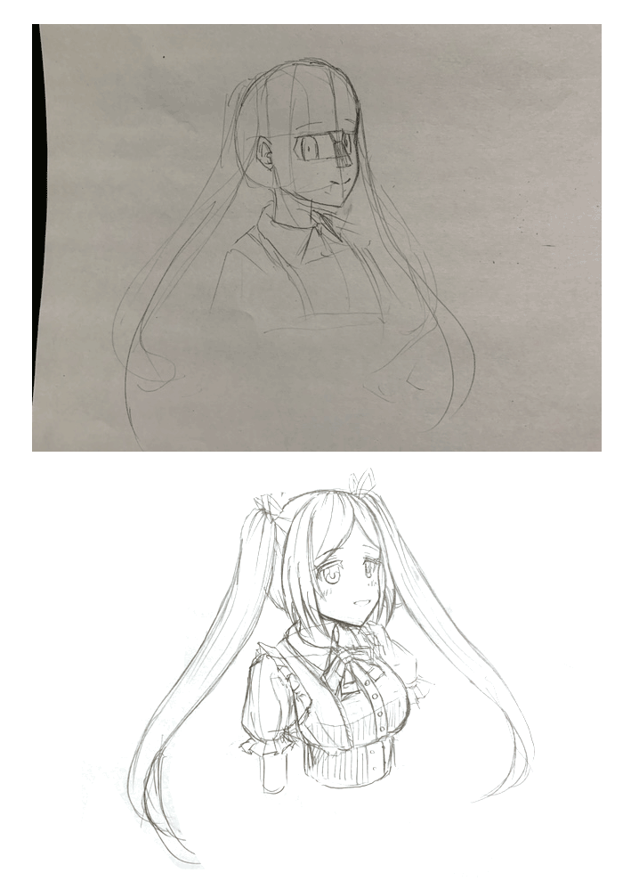 素体にない「ツインテール」「頭部の耳」のバランスがうまく取れなかった。線があるだけでも描きやすさがぐんとあがるので線だけでも描いていきたい。