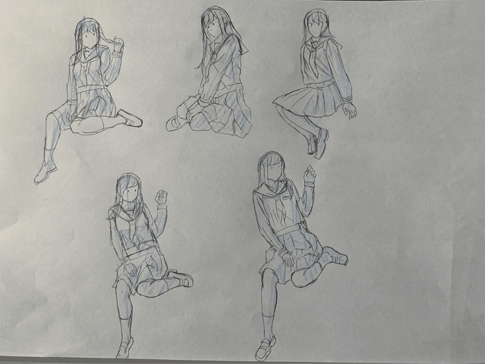 足を伸ばしているポーズでバランスを崩してしまうことが多かったのでこのポーズをやや多めに選択。今回も素体の時点でバランスを確認しながらの取り組みができた。こうやってブログに載せることで「なんとなく続けるだけ」の練習から「見られているので少しでも良くなるように描こう」という意識の変化が出てきた気がする。